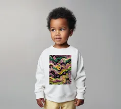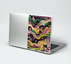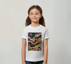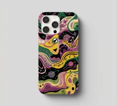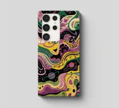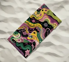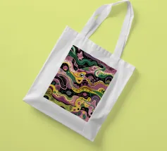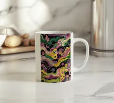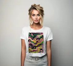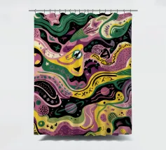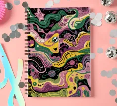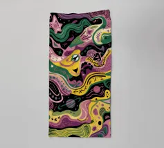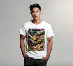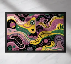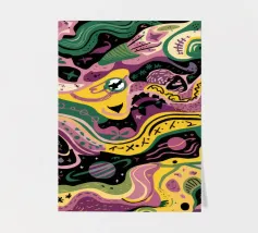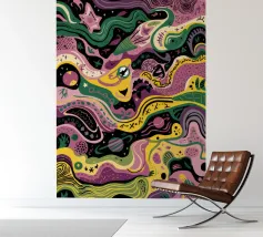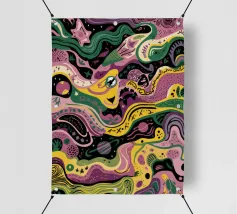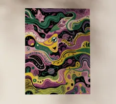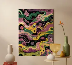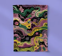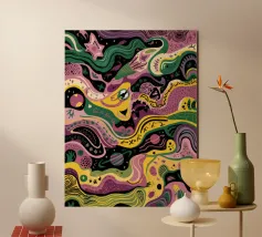 Una composizione intricata e astratta, dominata da verdi e viola vibranti, caratterizzata da linee vorticose e forme organiche. La complessità labirintica e le forme fluide creano un senso di profondità enigmatica e di flusso naturale.