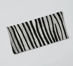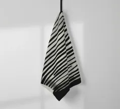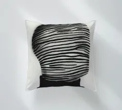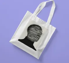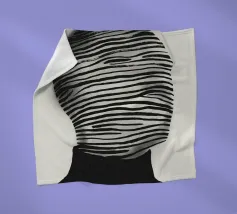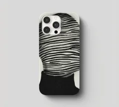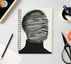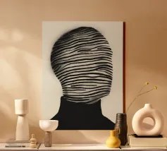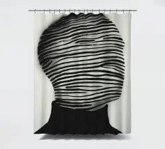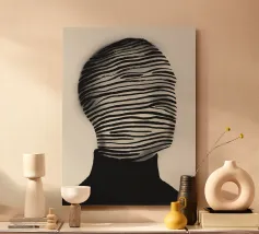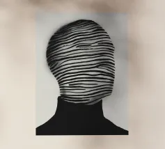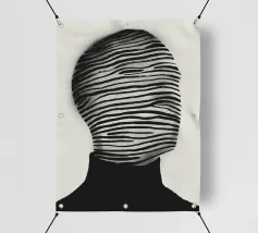 La forma della testa è coperta da linee orizzontali nere che oscurano i tratti del viso e creano un effetto astratto. Lo sfondo e l'abbigliamento sono minimalisti, per mettere in risalto il motivo a righe.
