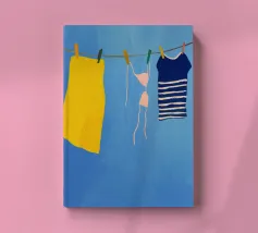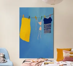 Bucato appeso a un filo per i panni sotto il sole estivo. Abbigliamento colorato che si asciuga contro un cielo blu. Bikini e moda estiva dal design minimalista. Illustrazione di Henry Rivers.