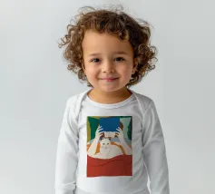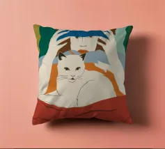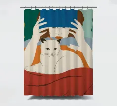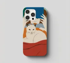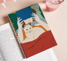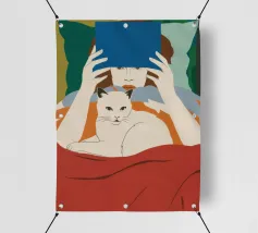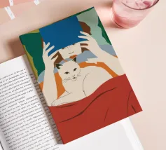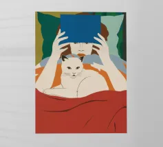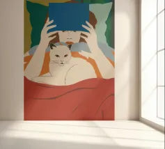 Una commovente illustrazione di una persona che legge un libro a letto, con un gatto bianco accoccolato sul petto. La scena è una rappresentazione accogliente, intima e serena di una compagnia perfetta e tranquilla.