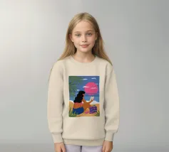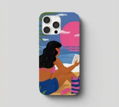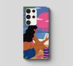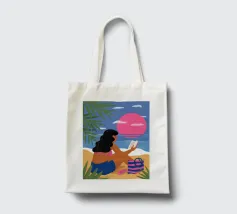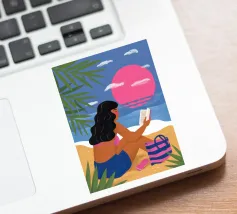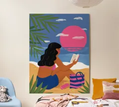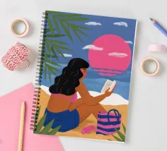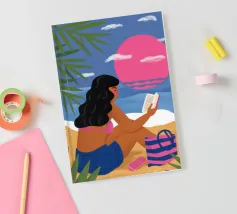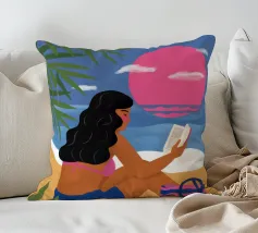Una donna con un cappello da sole legge un libro sulla spiaggia, con un cestino da picnic accanto. La scena è una rappresentazione perfetta, serena e idilliaca di una vacanza estiva rilassante e intellettuale.