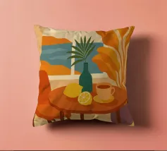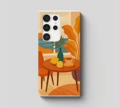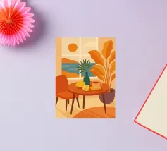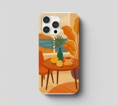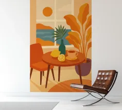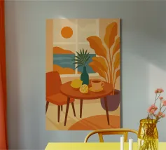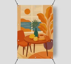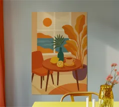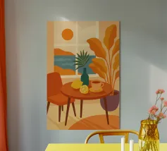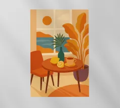 Una natura morta solare dal sapore mediterraneo: limoni, una tazza di tè e morbide piante dai caldi colori della terra invitano a soffermarsi. Questo poster porta pace e atmosfera estiva in ogni stanza.