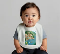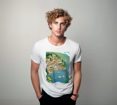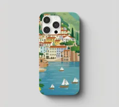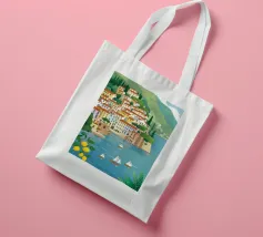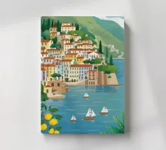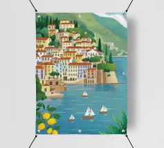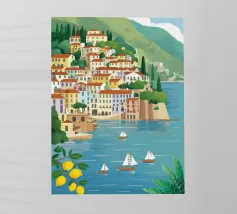 Illustrazione panoramica di una classica città costiera italiana adagiata in una baia, con alberi di limone in primo piano, case bianche sulle scogliere e barche a vela sull'acqua.