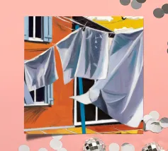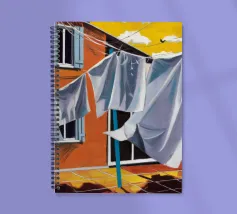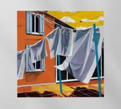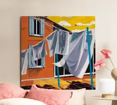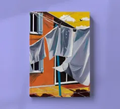 Lenzuola bianche e panni stesi al vento su uno stendibiancheria contro un edificio arancione e un cielo luminoso, catturano il movimento e la libertà.
