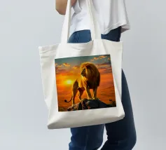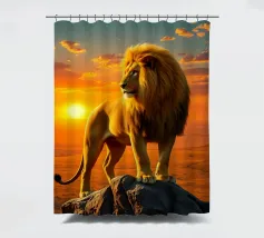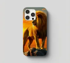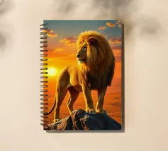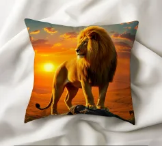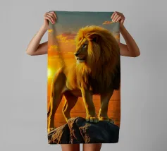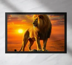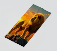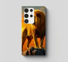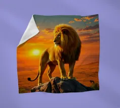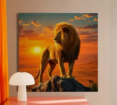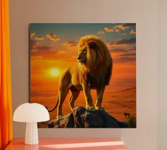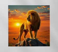 Maestoso leone che domina la savana in stile iperrealistico Una suggestiva immagine di un leone dalla testa d'oro che osserva la savana africana da uno sperone roccioso. L'immagine cattura il caldo tramonto e la potente presenza del leone con dettagli iperrealistici.