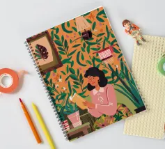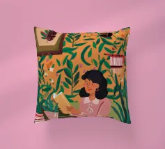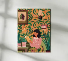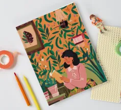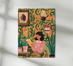 Una donna trova un momento di tranquillità per leggere, circondata da piante rigogliose e da un gatto curioso, sullo sfondo di una bellissima carta da parati ispirata alla natura.
