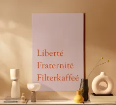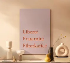 🇫🇷☕ Liberté, Fraternité ... Filterkaffée! Questo simpatico design è una reinterpretazione in chiave ironica del famoso motto francese, con una speciale aggiunta di caffeina. La classica frase tricolore viene spezzata in modo affascinante dall'aggiunta di "Filterkaffée", con le ultime lettere scritte volutamente in stile tedesco con l'accento sulla "e" - un riferimento ironico alla fusione culturale franco-tedesca.