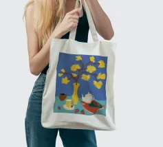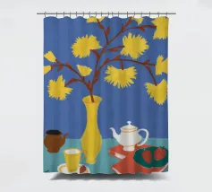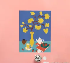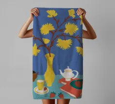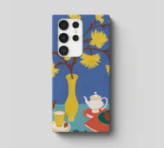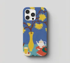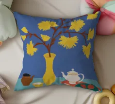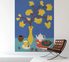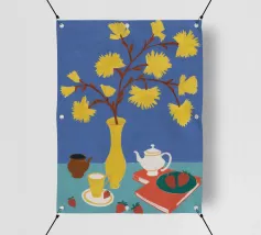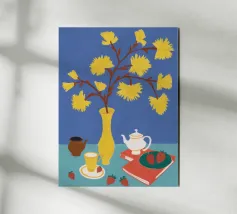 Natura morta di un bouquet di fiori gialli in un semplice vaso, appoggiato su un libro accanto a una teiera bianca. La composizione su uno sfondo blu intenso è classica, intellettuale e splendidamente serena.