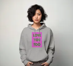 Un'illustrazione moderna e creativa dai vivaci colori verde-viola esprime il messaggio "Love You Too" a grandi lettere e celebra l'amore e la fiducia tra le persone. Perfetta per occasioni romantiche come i matrimoni!