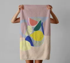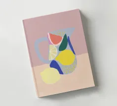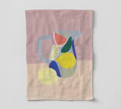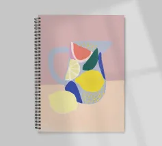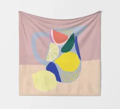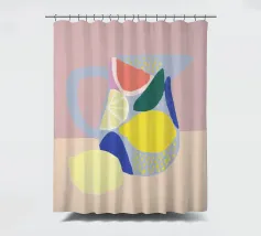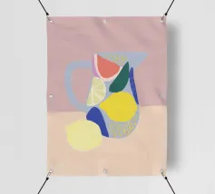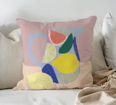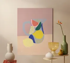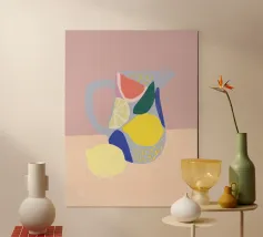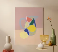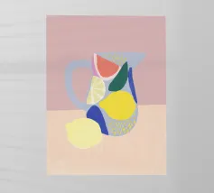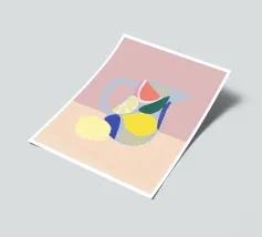 Questo moderno design grafico pastello mostra una brocca stilizzata di limonata rinfrescante circondata da limoni e angurie fruttate. Lo sfondo rosa e il design minimalista conferiscono all'arte della cucina un'allegra atmosfera estiva. Una stampa d'arte fresca e scandinava che celebra la natura e il cibo.