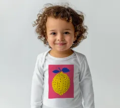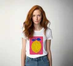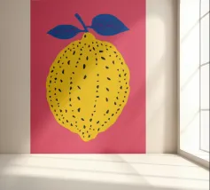 Un singolo, grande limone giallo con foglie stilizzate è raffigurato su un vibrante sfondo rosa caldo, creando una dichiarazione pop art audace e minimalista.
