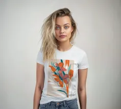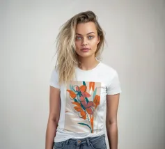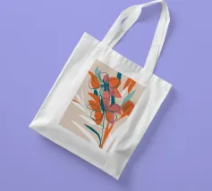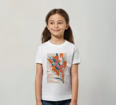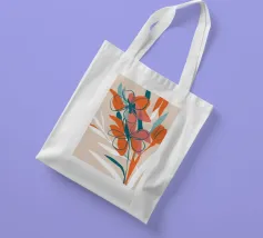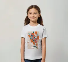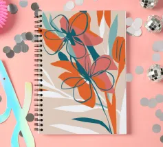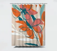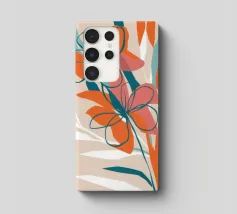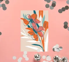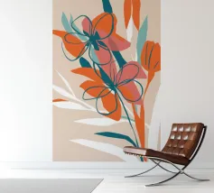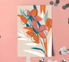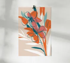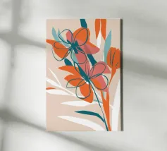 Un'elegante composizione astratta di fiori resa con un'espressiva line art arancione su forme di sfondo morbide e neutre. Lo stile è moderno e delicato.