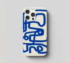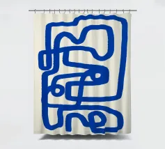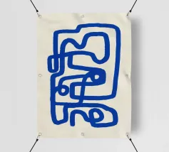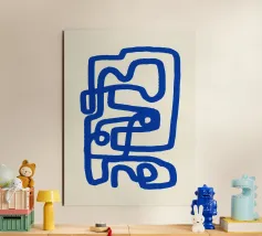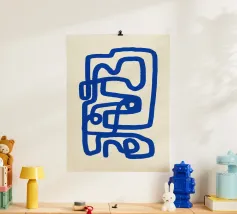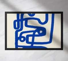 Un'audace linea blu a ghirigori forma un disegno astratto su un semplice sfondo bianco. Con le sue forme sinuose e curvilinee, il disegno crea un senso di movimento e fluidità.
