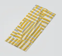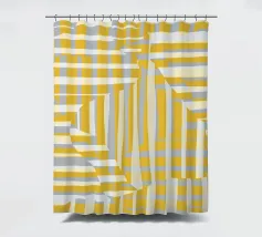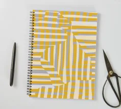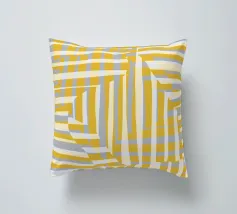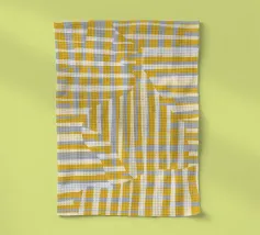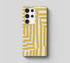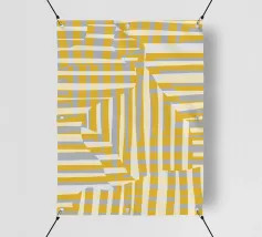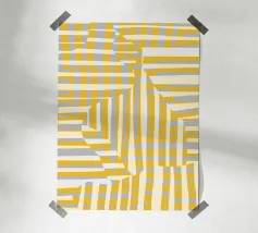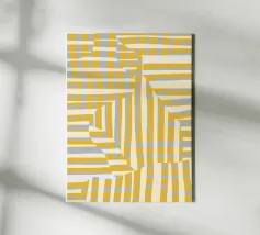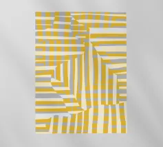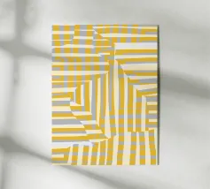 Le strisce gialle e grigie si intersecano per formare un motivo a griglia dinamico, creando un senso di profondità e movimento nella composizione. Le linee sovrapposte e le varie tonalità conferiscono al pezzo un'atmosfera geometrica e astratta.