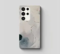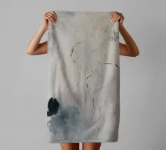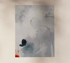 Un'opera d'arte astratta minimalista con uno sfondo chiaro e strutturato nei toni del grigio e del beige, caratterizzato da delicate linee nere e sottili accenti rossi, che evocano un senso di segreti sussurrati o tracce di cenere.