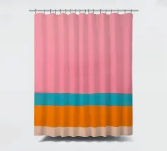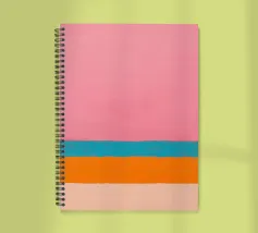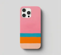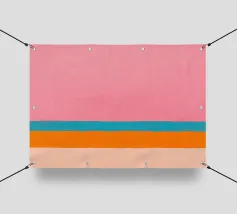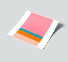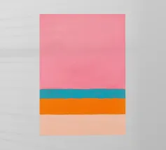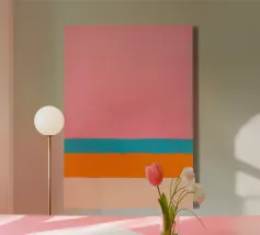 Pittura acrilica con due linee orizzontali in blu e arancione su sfondo rosa. Forme chiare, colori piatti e texture morbide caratterizzano l'opera minimalista. La composizione armoniosa e simmetrica emana calma ed equilibrio e attira lo sguardo sui dettagli.