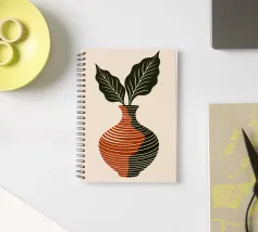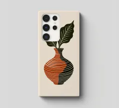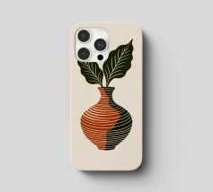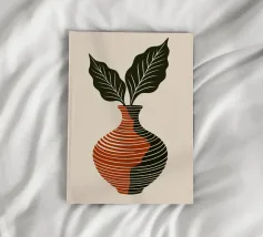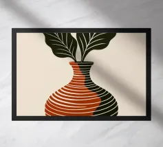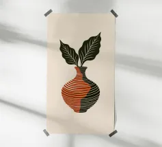 Portate a casa vostra un tocco di moderna raffinatezza ed eleganza naturale con questa suggestiva stampa d'arte. Questo pezzo presenta un disegno unico e astratto di un vaso diviso in due sezioni distinte. Un lato è una terracotta calda e terrosa, mentre l'altro è un nero deciso, entrambi ornati da intricate linee orizzontali ondulate che creano un senso di movimento e consistenza. Due foglie stilizzate di colore verde scuro emergono dalla parte superiore, aggiungendo un elemento organico semplice e grazioso. Perfetta per un'estetica minimalista, bohémien o moderna di metà secolo, questa stampa è un'aggiunta versatile a qualsiasi salotto, camera da letto o ufficio,