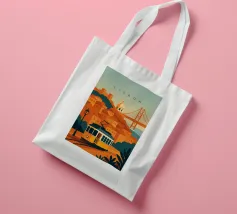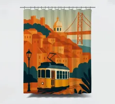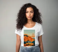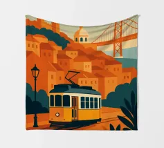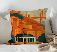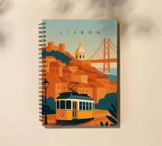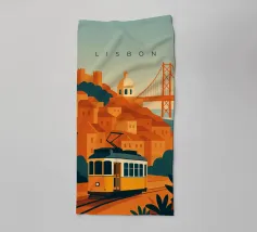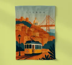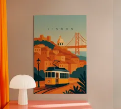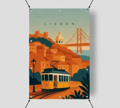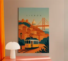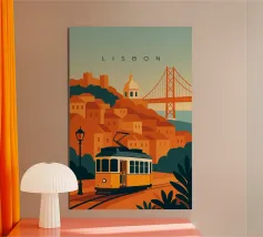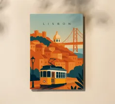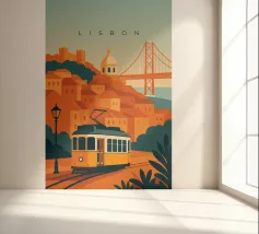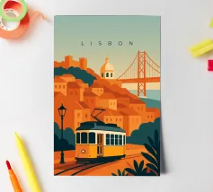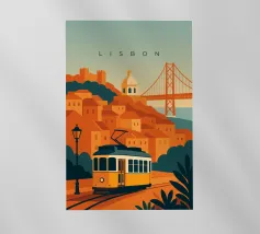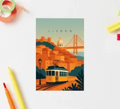Design minimalista del Portogallo della capitale Lisbona con alcune attrazioni tipiche in stile poster di viaggio stilizzato.