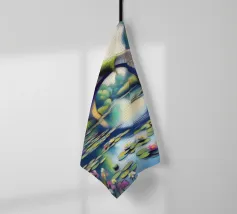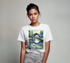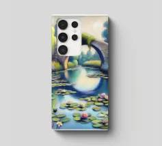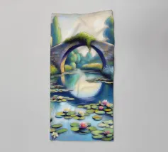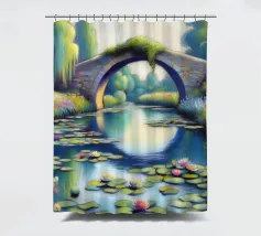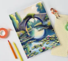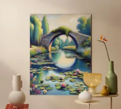 Scenografico e tranquillo stagno di ninfee con ponte realizzato in colori pastello.