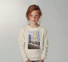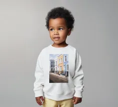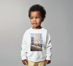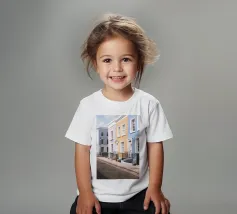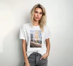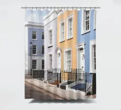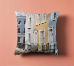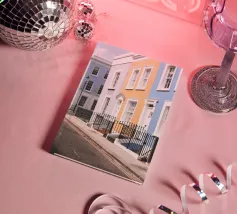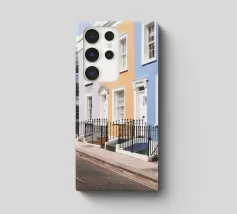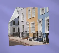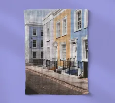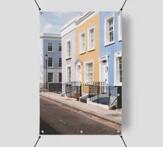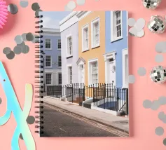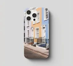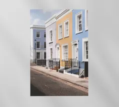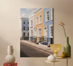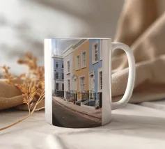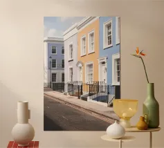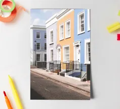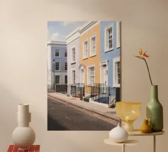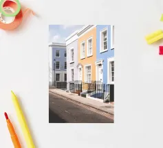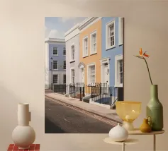 Immergetevi nell'atmosfera unica di Notting Hill a Londra con questa veduta stradale fiancheggiata da case con facciate geometriche color pastello e l'elegante architettura vittoriana di un paesaggio urbano britannico.