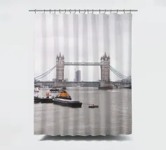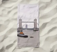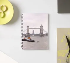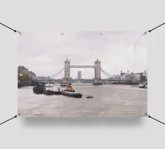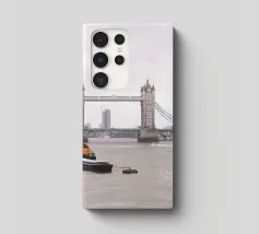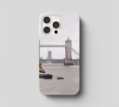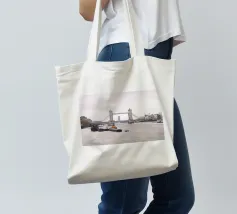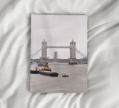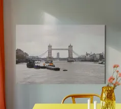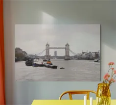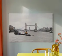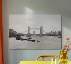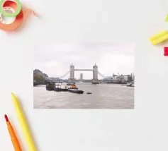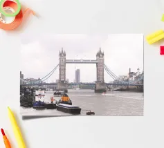 Sotto un cielo nuvoloso, il Tower Bridge, sul fiume Tamigi, circondato da edifici storici in mattoni e barche iconiche, per una vista panoramica dello skyline di Londra.
