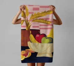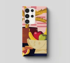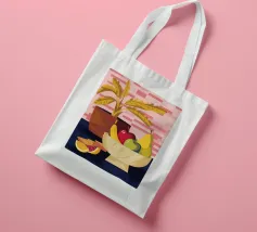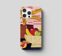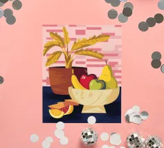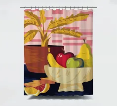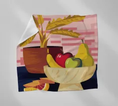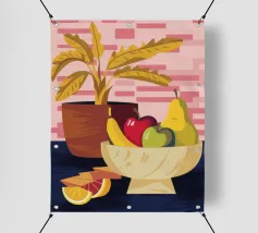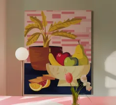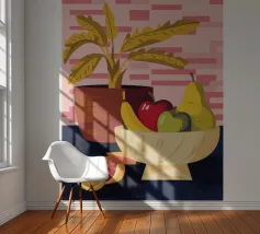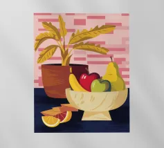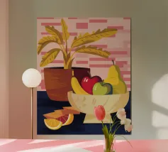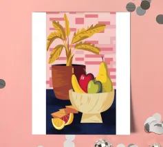 Una ciotola piena di vari frutti come pere, mele e arance è raffigurata su un tavolo, con la luce che proietta le ombre. Una pianta in vaso è sullo sfondo, creando una natura morta calda e invitante.