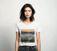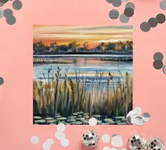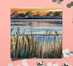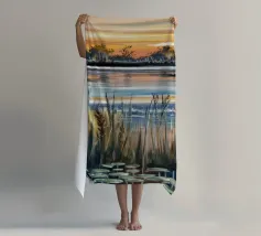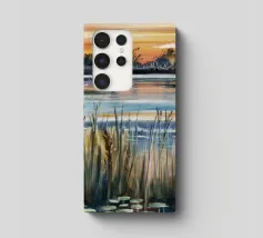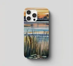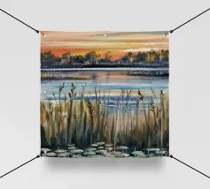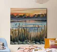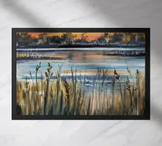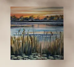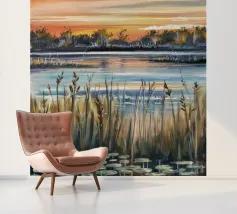 Morbide canne ondeggiano su acque piene di gigli sotto cieli dorati, formando una lirica danza naturale.