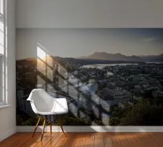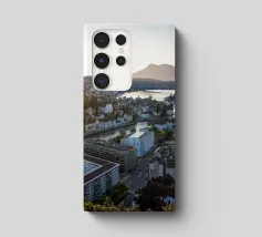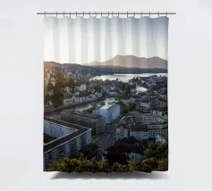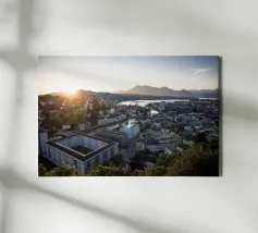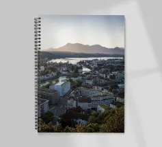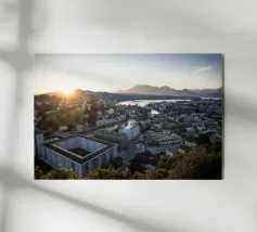 Vista della città di Lucerna, in Svizzera, da Chateau Gütsch all'alba. La montagna sullo sfondo si chiama Rigi.