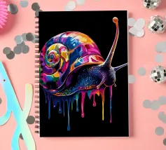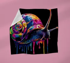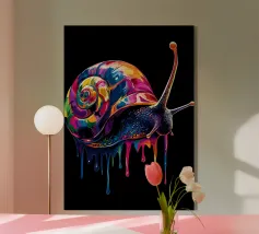 Una lumaca colorata con un disegno dettagliato e colori intensi scivola su uno sfondo nero. Il suo guscio a forma di spirale è disegnato con vivaci tonalità di giallo, rosa, blu, verde e arancione, che colano come colori liquidi. Il corpo della lumaca ha una superficie strutturata con motivi a punti in tonalità vivaci. La fusione dei colori dà un'impressione surreale e artistica, come se la lumaca stessa fosse fatta di colori vivi. Una rappresentazione visivamente accattivante, ricca di dinamismo e contrasti.