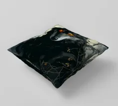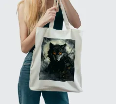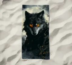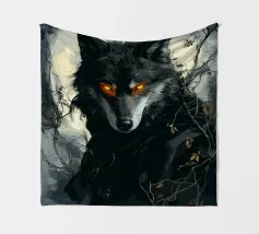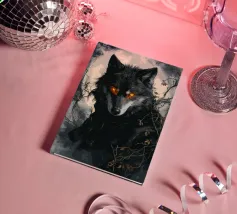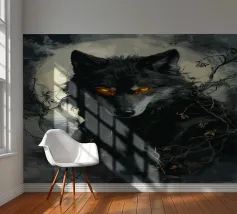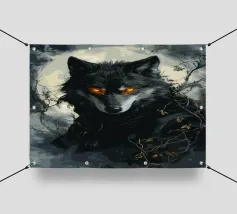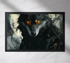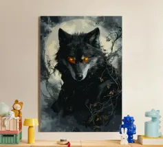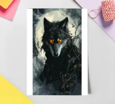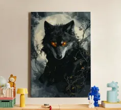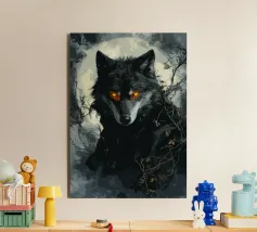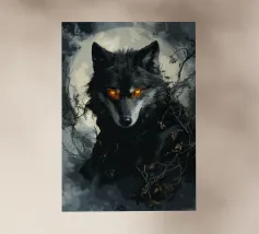 Questa impressionante opera d'arte mostra un lupo nero con occhi arancioni che emerge misteriosamente dalla nebbia di una foresta. La luna piena sullo sfondo rafforza l'atmosfera mistica e minacciosa, mentre i rami spogli e le tonalità di colore tenui conferiscono all'immagine un'atmosfera cupa e profonda. Gli occhi luminosi formano un intenso contrasto con i toni freddi del grigio e del blu dell'ambiente circostante, facendo apparire il lupo minaccioso e maestoso. Questo motivo è perfetto per gli amanti delle illustrazioni fantasy e dark art, per gli appassionati di lupi e di misticismo.