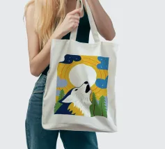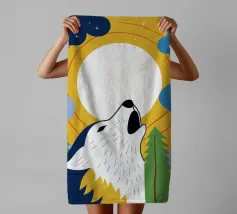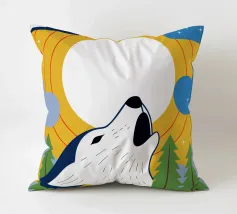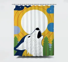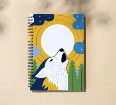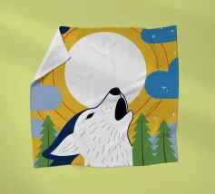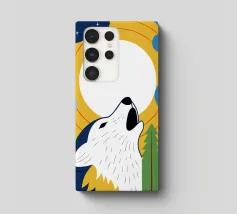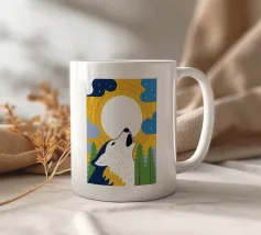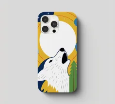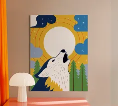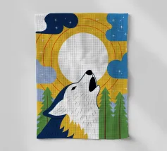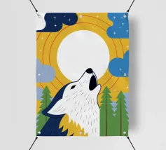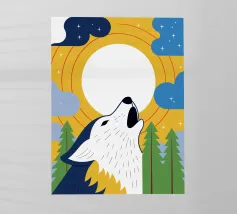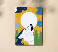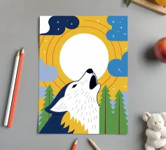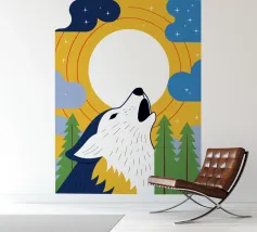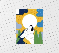 Godetevi una vivace illustrazione della fauna selvatica con un lupo che ulula alla luna con alberi e stelle sullo sfondo.