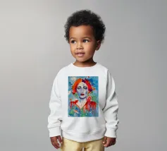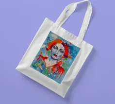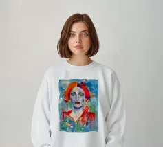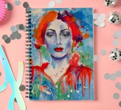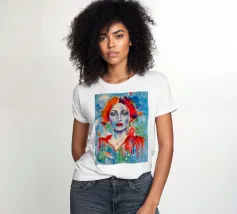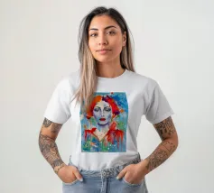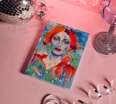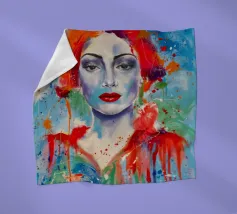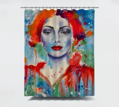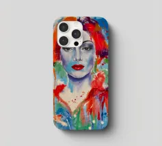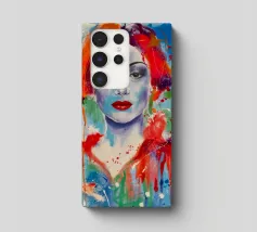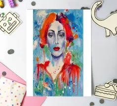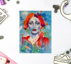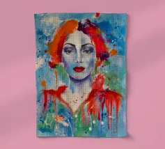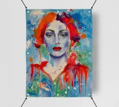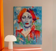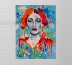 Un suggestivo ritratto di donna il cui volto è ornato da vistose macchie di vernice rossa e blu, con un effetto di sgocciolamento, su uno sfondo vibrante, astratto e colorato.