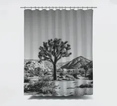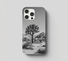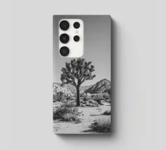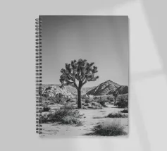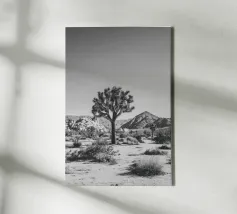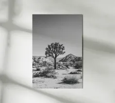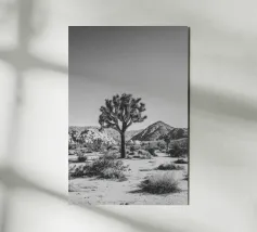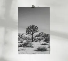Fotografia in bianco e nero che mostra un maestoso Joshua Tree che svetta in un aspro paesaggio desertico.