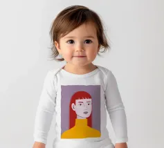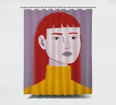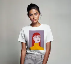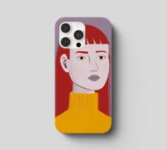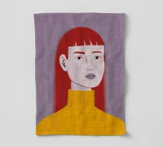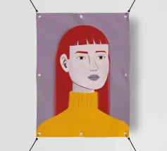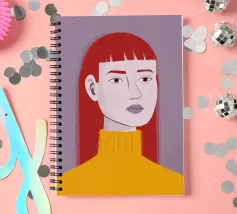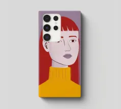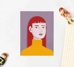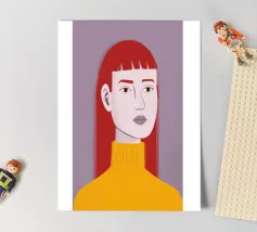 Una figura androgina con corti capelli rossi e un maglione a collo alto giallo brillante guarda in avanti con un'espressione neutra e convincente.