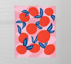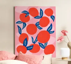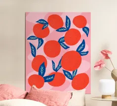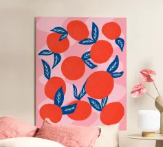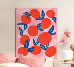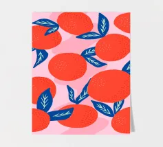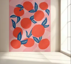 Aggiungete un'esplosione di fascino succoso e agrumato al vostro spazio con questa illustrazione audace e giocosa di vibranti mandarini. I frutti di colore arancione brillante, le foglie blu intenso e lo sfondo rosa tenue creano un contrasto moderno e accattivante che irradia calore ed energia. Questo motivo contemporaneo di frutta è perfetto per gli amanti dei disegni freschi e allegri e dell'estetica mediterranea. Ideale per cucine, sale da pranzo o come regalo rinfrescante per gli amanti della frutta, questa opera d'arte aggiunge un tocco divertente e vivace a qualsiasi ambiente.