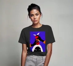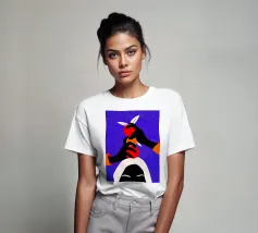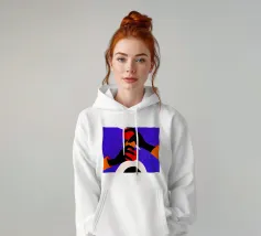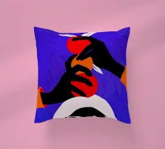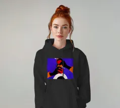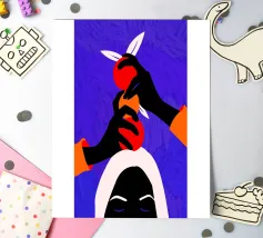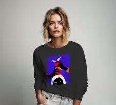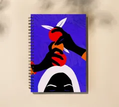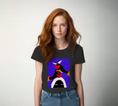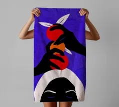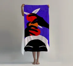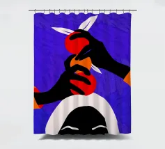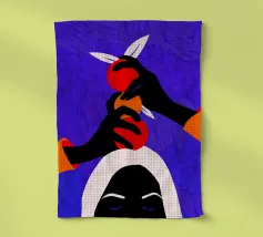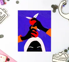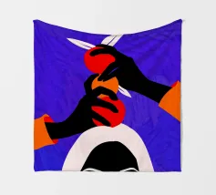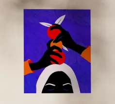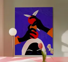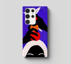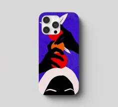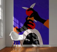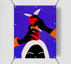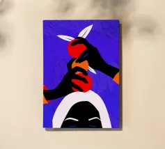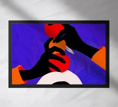 Un'illustrazione audace e moderna, caratterizzata da mani scure e sagomate che bilanciano con cura arance vibranti. Il contrasto tra le ombre profonde e il ricco sfondo viola crea un senso di dramma e armonia. Questa composizione minimale ma espressiva celebra la bellezza delle forme semplici e dei colori vivaci.