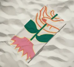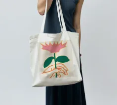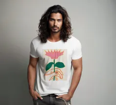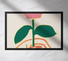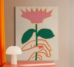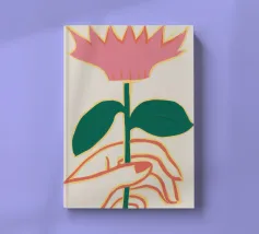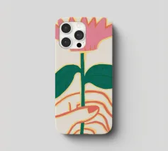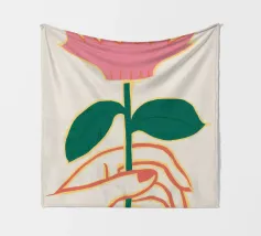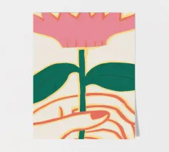 Illustrazione minimalista di due mani che tengono delicatamente il gambo di un grande e singolare fiore rosa. L'immagine trasmette un senso di cura, fragilità e bellezza.
