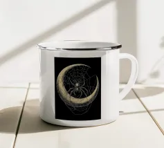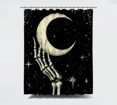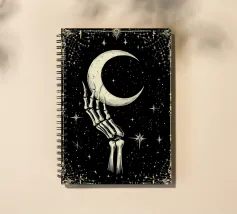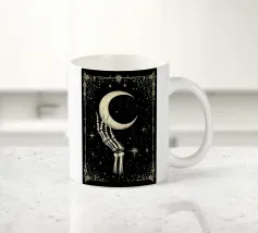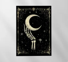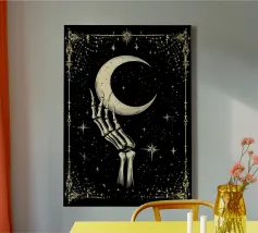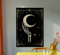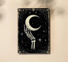 Questa dettagliata opera d'arte mostra una mano ossuta che tiene una delicata mezzaluna, incorniciata da stelle e da una cornice dorata. Lo sfondo scuro fa sembrare la scena una visione notturna, mentre il design di ispirazione vintage con ragnatele e ornamenti conferisce un'estetica mistica, quasi vittoriana. Ideale per gli amanti dei disegni esoterici, astrologici o gotici. Questo quadro crea un'atmosfera tranquilla e magica che invita a sognare o a riflettere.