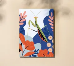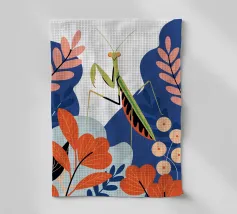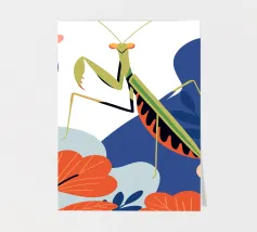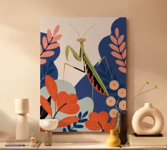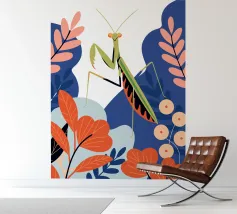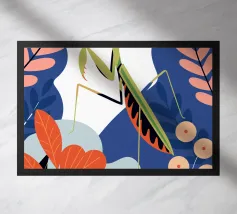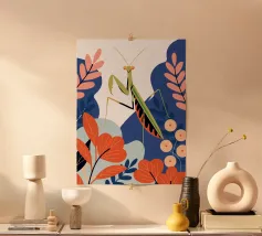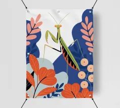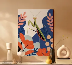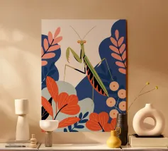 Lasciatevi affascinare dalla bellezza di una mantide religiosa in mezzo a un giardino colorato in questa illustrazione. I colori vivaci e il design dettagliato creano un'atmosfera unica e accattivante.