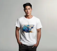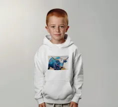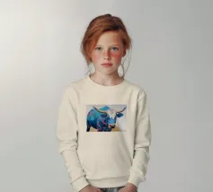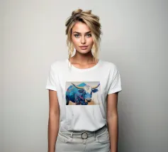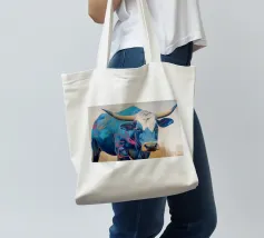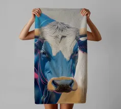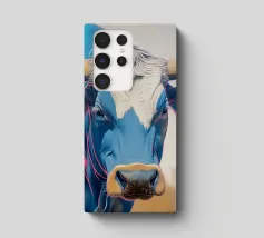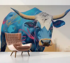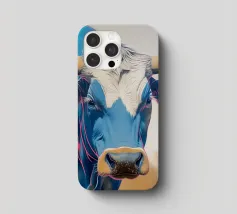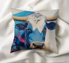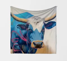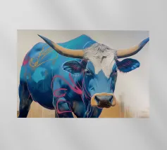 Questa vibrante illustrazione pop art di una mucca nei toni del blu e del rosa unisce la fantasia alla pittura astratta e porta colore e creatività nel mondo animale.