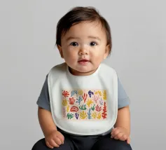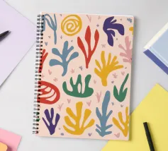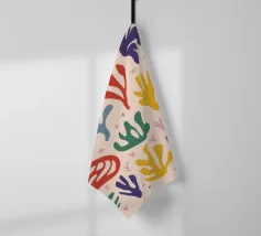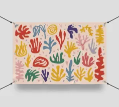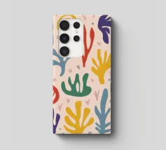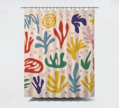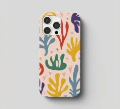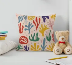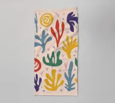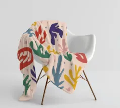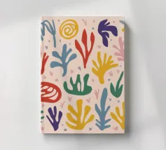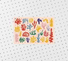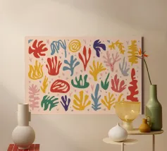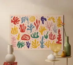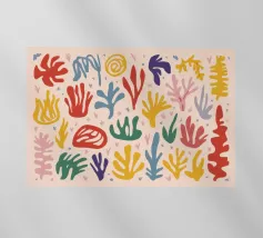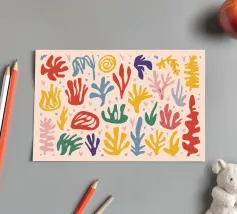 Una vibrante e gioiosa composizione astratta di foglie colorate e forme organiche nello stile dei ritagli di Henri Maraoui. La composizione è dinamica e piena di vita.