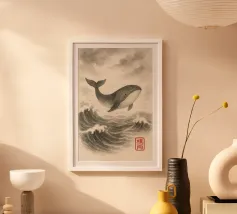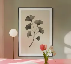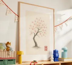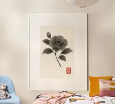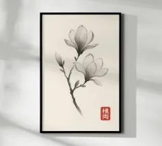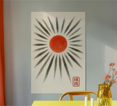 Un'opera d'arte minimalista nello stile delle tradizionali stampe xilografiche giapponesi. Tre margherite stilizzate si ergono erette e fiere su uno sfondo beige. I contorni netti e neri, la tavolozza di colori caldi con i centri dei fiori gialli e il sigillo Inkan rosso nell'angolo conferiscono al motivo un mix armonioso di grazia naturale ed estetica dell'Estremo Oriente. Ideale come decorazione murale per gli amanti del design zen, del Giappone vintage e della grafica floreale.