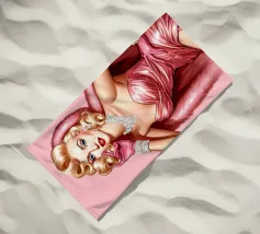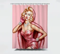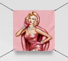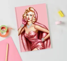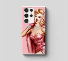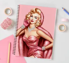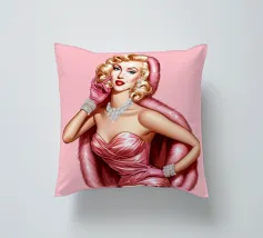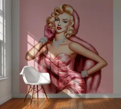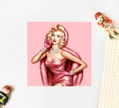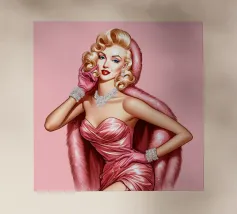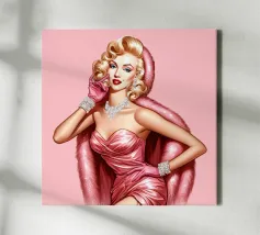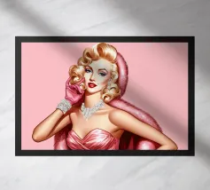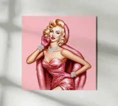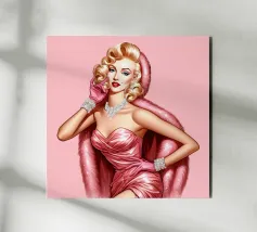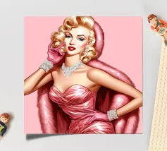 Illustrazione di moda natalizia di Marilyn Monroe in abito rosa natalizio glamour vintage con guanti rosa, bracciali di diamanti e collana di diamanti.