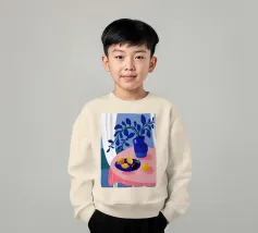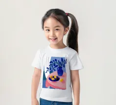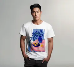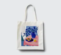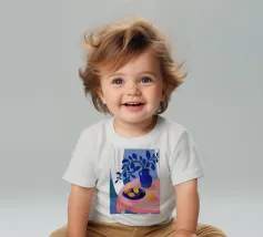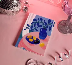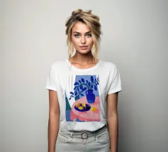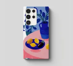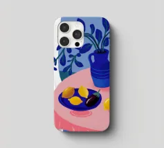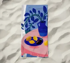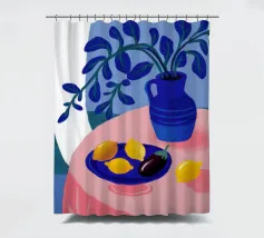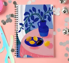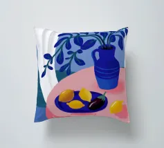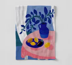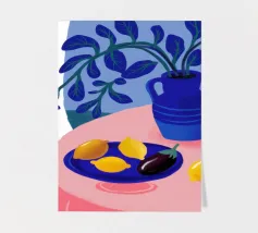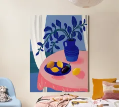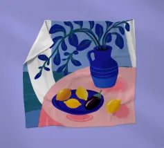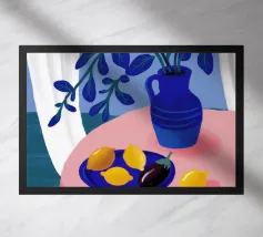 Una serena natura morta con un vaso blu con fiori delicati su un tavolo. Accanto ad esso, una ciotola contiene limoni gialli brillanti che aggiungono un tocco di colore. La scena è immersa nei toni del blu, evocando un'atmosfera mattutina calma e pacifica.