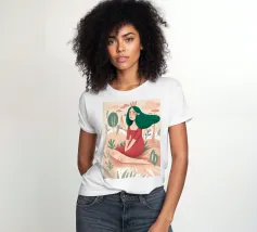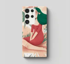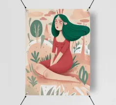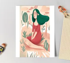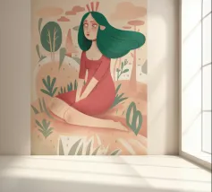 Questa opera d'arte raffigura una figura seduta in un giardino circondato da piante e alberi. La figura indossa un abito rosso e la scena evoca un senso di tranquillità e meditazione.