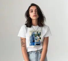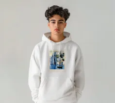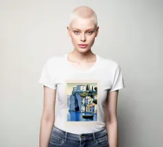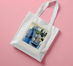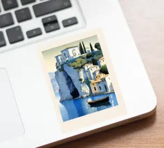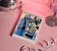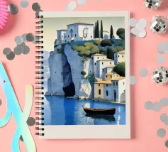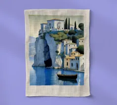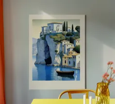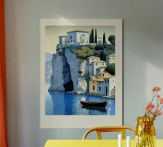 Una serena scena costiera mediterranea rappresentata in uno stile pittorico e sognante. Ville imbiancate a calce con tetti in terracotta sono adagiate su drammatiche scogliere sopra un tranquillo mare blu. Una piccola barca di legno galleggia dolcemente in primo piano, evocando un senso di pace e bellezza senza tempo. Un'opera d'arte da parete ideale per gli amanti dei paesaggi italiani, dei villaggi costieri e delle fughe poetiche.
