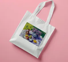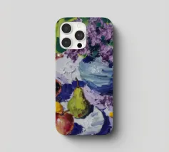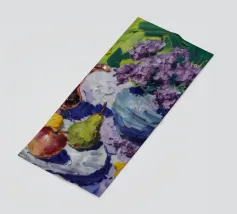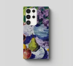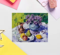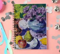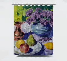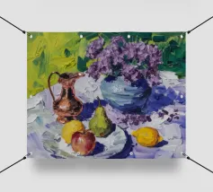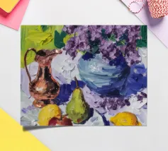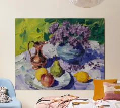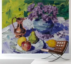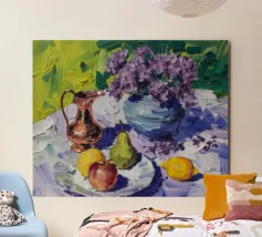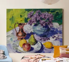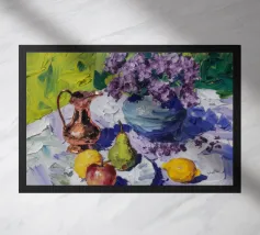 Una ricca natura morta con un bouquet di profumati lillà viola disposti in una brocca rustica di rame o marrone, accompagnati da pere fresche e limoni brillanti, il tutto su un tavolo drappeggiato con un panno blu intenso.