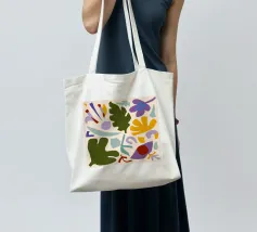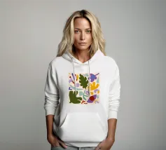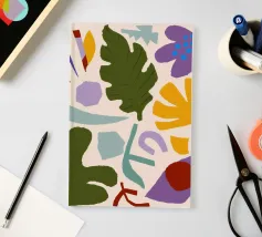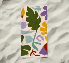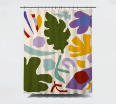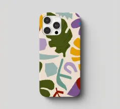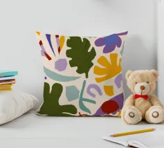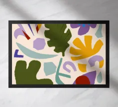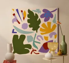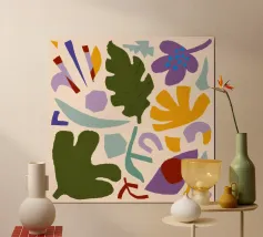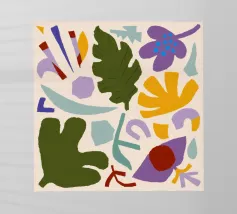 Un motivo astratto giocoso e caotico di varie forme organiche, foglie e ghirigori in una palette di colori vivaci e primari.