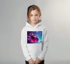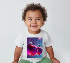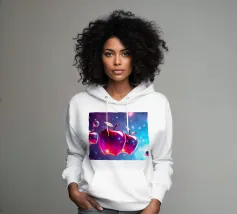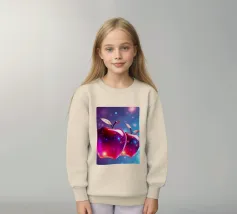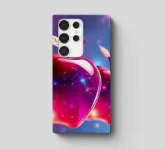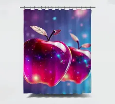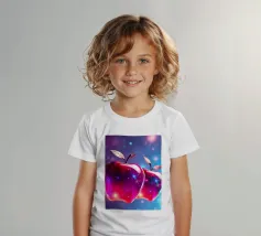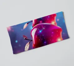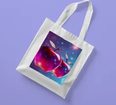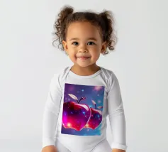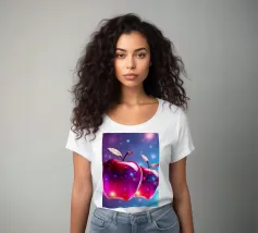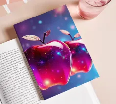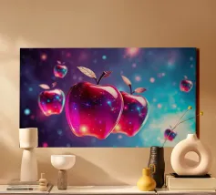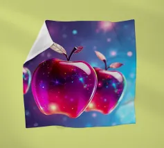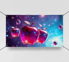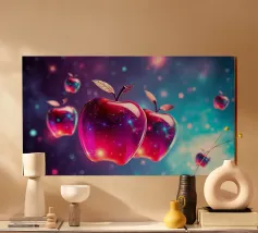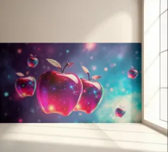 Mele lucide con un vivace disegno cosmico fluttuano su uno sfondo colorato e pieno di luci scintillanti.