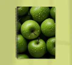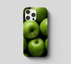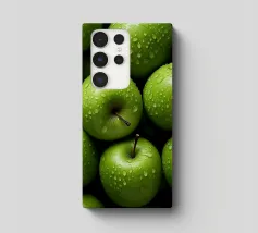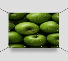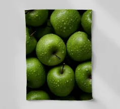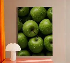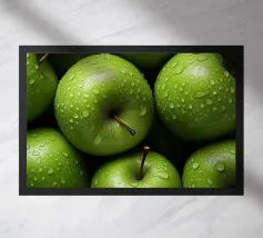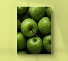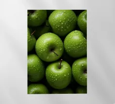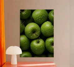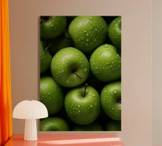 mele verdi gocce d'acqua frutta fresca gambo colore verde consistenza naturale freschezza umidità primo piano mangiare sano biologico forme rotonde mucchio di frutta buccia di mela superficie liscia colore vivace succoso dettaglio raccolto agricoltura